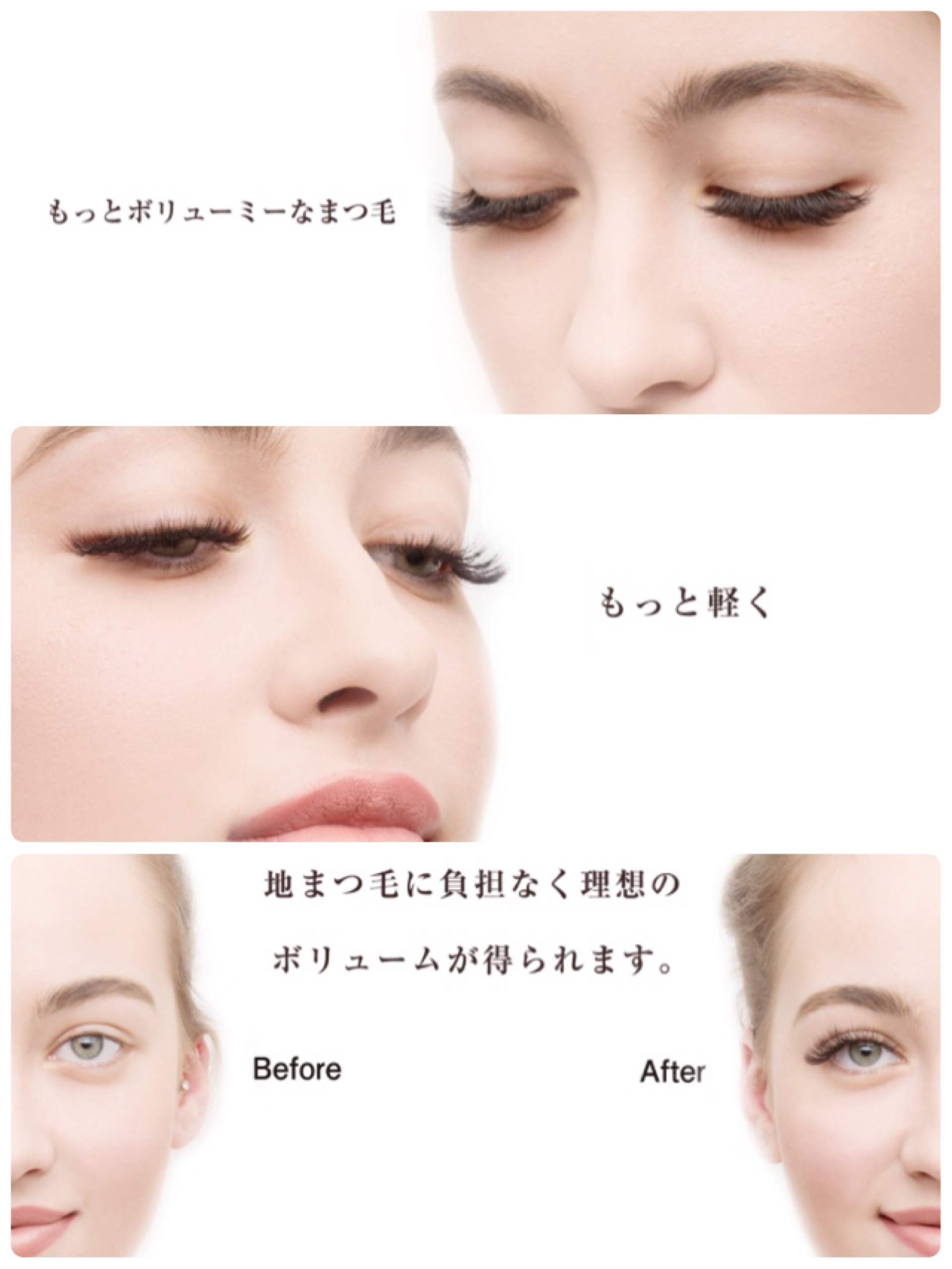 エアリーボリュームラッシュの利点は、軽くて付いている感じがしない。繊細でナチュラルな仕上がり。